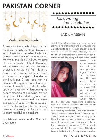 Ramadan is the 9thmonth of the Islamic Asia. The one and only Nazia Hassan, who was