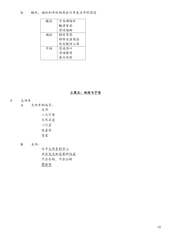 B 酸性、碱性和中性物质在日常生活中的用途 酸性 作为调味料 腌渍食品 清洗墙面 碱性 制作胃药 制作洗涤用品 改良酸性土壤 中性 清洗伤口 清洗眼睛 进行实验 主题五:地球与宇宙 9 太阳系 A 太阳系的成员: 太阳 八大行星 天然卫星 小行星 流星体 彗星 B 太阳: 位于太阳系的中心 是会发光和发热的恒星 只会自转,不会公转 圆球体 13