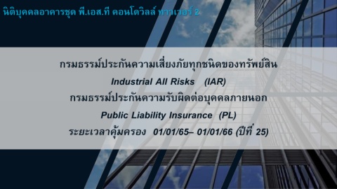 ี ี นิติบุคคลอาคารชุด พ.เอส.ท คอนโดวิลล์ ทาวเวอร์ 2 กรมธรรม์ประกันความเสยงภัยทุกชนิดของทรัพย์สิน ่ ี Industrial All Risks (IAR) กรมธรรม์ประกันความรับผิดต่อบุคคลภายนอก Public Liability Insurance (PL) ี ี ้ ระยะเวลาคุมครอง 01/01/65– 01/01/66 (ปท่ 25)