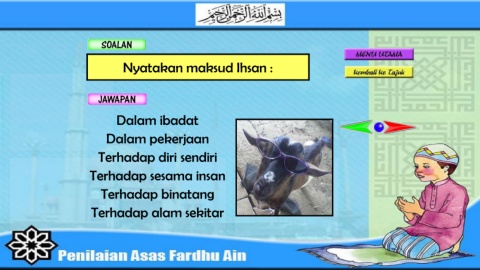 Nyatakan maksud Ihsan : Dalam ibadat Dalam pekerjaan Terhadap diri sendiri Terhadap sesama insan Terhadap binatang Terhadap alam sekitar