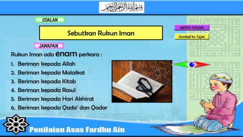 Sebutkan Rukun Iman Rukun Iman ada enam perkara : 1. Beriman kepada Allah 2. Beriman kepada Malaikat 3. Beriman kepada Kitab 4. Beriman kepada Rasul 5. Beriman kepada Hari Akhirat 6. Beriman kepada Qada’ dan Qadar