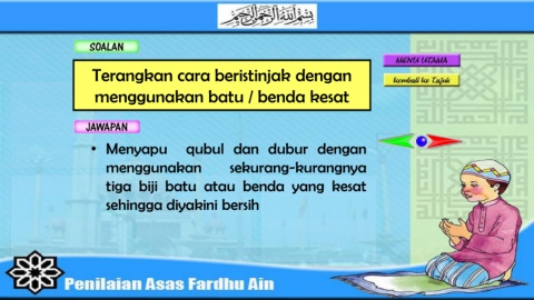 Terangkan cara beristinjak dengan menggunakan batu / benda kesat • Menyapu qubul dan dubur dengan menggunakan sekurang-kurangnya tiga biji batu atau benda yang kesat sehingga diyakini bersih