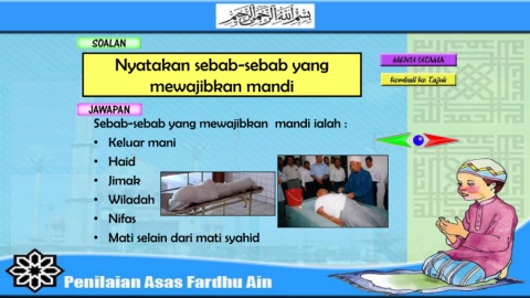 Nyatakan sebab-sebab yang mewajibkan mandi Sebab-sebab yang mewajibkan mandi ialah : • Keluar mani • Haid • Jimak • Wiladah • Nifas • Mati selain dari mati syahid