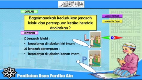 Bagaimanakah kedudukan jenazah lelaki dan perempuan ketika hendak disolatkan ? 1) Jenazah lelaki : • kepalanya di sebelah kiri imam 2) Jenazah perempuan : • kepalanya di sebelah kanan imam