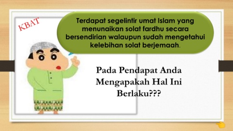 Terdapat segelintir umat Islam yang menunaikan solat fardhu secara bersendirian walaupun sudah mengetahui kelebihan solat berjemaah. Pada Pendapat Anda Mengapakah Hal Ini Berlaku???