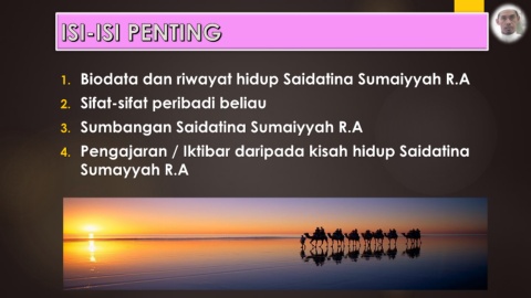 1. Biodata dan riwayat hidup Saidatina Sumaiyyah R.A 2. Sifat-sifat peribadi beliau 3. Sumbangan Saidatina Sumaiyyah R.A 4. Pengajaran / Iktibar daripada kisah hidup Saidatina Sumayyah R.A