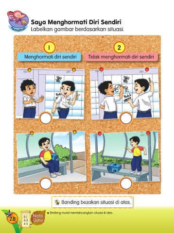 saya menghormati diri sendiri Labelkan gambar berdasarkan situasi. 1 2 2 Menghormati diri sendiri Tidak menghormati diri sendiri AJU BE KIM Banding bezakan situasi di atas. l Bimbing murid membincangkan situasi di atas. 28 6.1 6.3 6.5