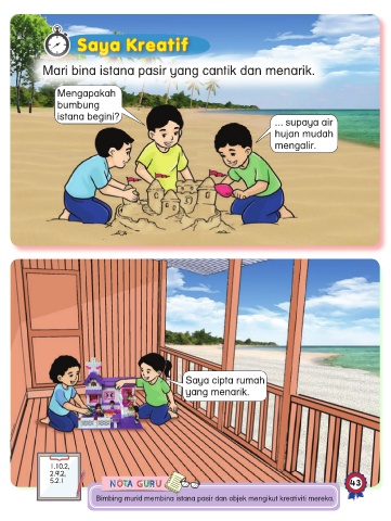 Bimbing murid membina istana pasir dan objek mengikut kreativiti mereka.