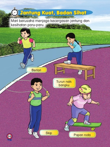 Jantung Kuat, Badan Sihat Mari berusaha menjaga kecergasan jantung dan kesihatan paru-paru. Berlari Turun naik bangku Skip 50 50 Papan roda