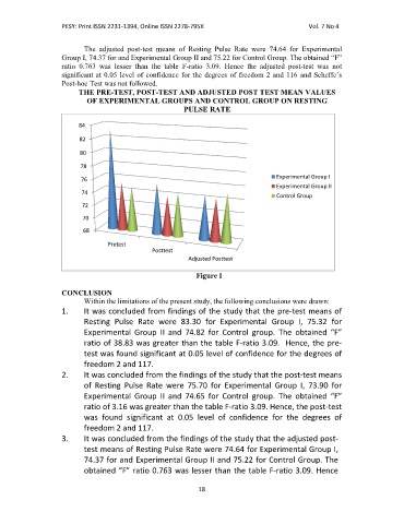 The adjusted post-test means of Resting Pulse Rate were 74.64 for Experimental
