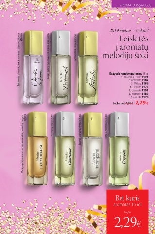Žaismingas citrusinis, aitrus aromatas su lengvu žalumos Gaivus gėlių ir citrusinis aromatas su jūros akordu Gurmaniškas vaisių aromatas melodijų šokį