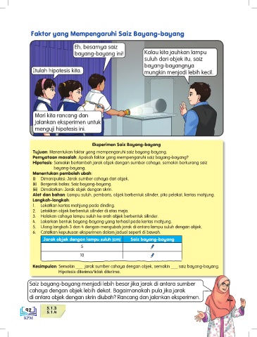 Kesimpulan: Semakin ___ jarak sumber cahaya dengan objek, semakin ___ saiz bayang-bayang.