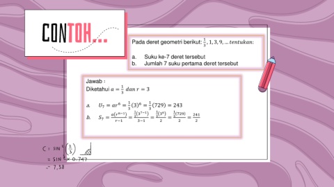 contoh... 1 Pada deret geometri berikut: , 1, 3, 9, … : 3 a. Suku ke-7 deret tersebut b. Jumlah 7 suku pertama deret tersebut Jawab ∶ 1 Diketahui = = 3 3 6 a. = = 1 3 6 = 1 729 = 243 7 3 1 3 1 1 −1 3 7−1 3 6 729 241 b. = = 3 = 3 = 3 = 7 −1 3−1 2 2 2