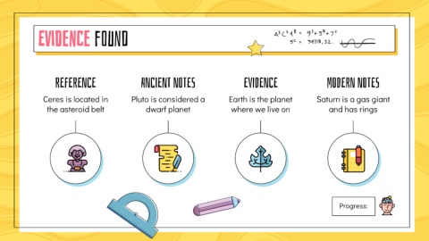 Evidence found REFERENCE ANCIENT NOTES EVIDENCE MODERN NOTES Ceres is located in Pluto is considered a Earth is the planet Saturn is a gas giant the asteroid belt dwarf planet where we live on and has rings Progress:
