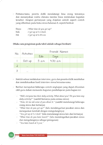 - “You get up at 5 o’clock” (lalu mendatangi siswa lain dan bertanya)