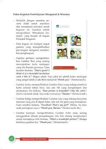 (Kartu ini indah sekali. Saya suka warnanya) “Thanks.” (Terima kasih.)