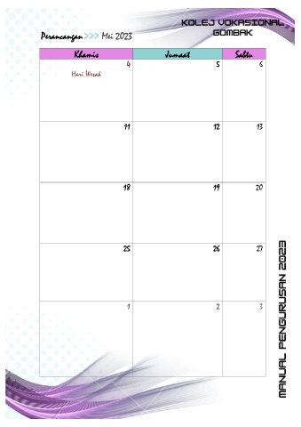 Perancangan >>> Mei 2023 Khamis Jumaat Sabtu 4 5 6 Hari Wesak 11 12 13 18 19 20 25 26 27 1 2 3