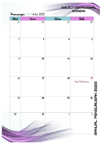 Perancangan >>> Julai 2023 Ahad Isnin Selasa Rabu 25 26 27 28 2 3 4 5 9 10 11 12 16 17 18 19 Awal Muharram 23 24 25 26 30 31 1 2