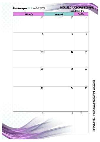 Perancangan >>> Julai 2023 Khamis Jumaat Sabtu 29 30 1 6 7 8 13 14 15 20 21 22 27 28 29 3 4 5