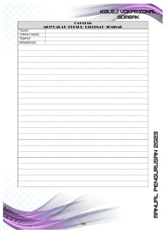 CATATAN MESYUARAT/ KURSUS/ TAKLIMAT/ SEMINAR TAJUK: TARIKH/ MASA: TEMPAT: PENGERUSI: 146