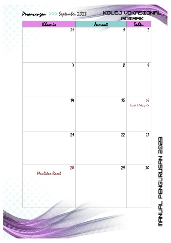 Perancangan >>> September 2023 Khamis Jumaat Sabtu 31 1 2 7 8 9 14 15 16 Hari Malaysia 21 22 23 28 29 30 Maulidur Rasul
