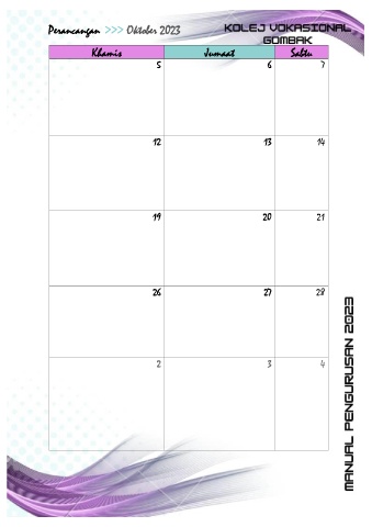Perancangan >>> Oktober 2023 Khamis Jumaat Sabtu 5 6 7 12 13 14 19 20 21 26 27 28 2 3 4