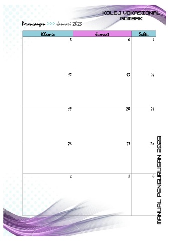 Perancangan >>> Januari 2023 Khamis Jumaat Sabtu 5 6 7 12 13 14 19 20 21 26 27 28 2 3 4