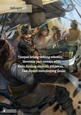 Selingan Tampak helang terbang sekawan, Merentas puri menuju selat, Keris dijulang simbolik pahlawan, Taat dipatri meenjunjung daulat