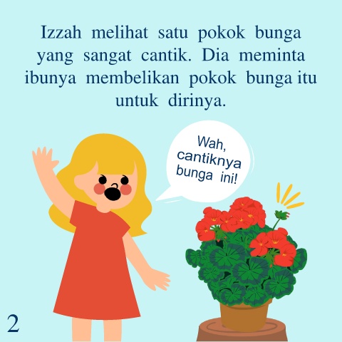 Izzah melihat satu pokok bunga yang sangat cantik. Dia meminta ibunya membelikan pokok bunga itu untuk dirinya. 2