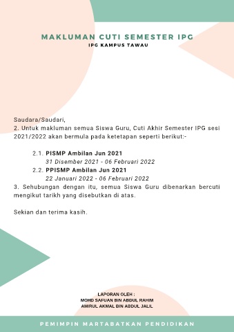 2. Untuk makluman semua Siswa Guru, Cuti Akhir Semester IPG sesi