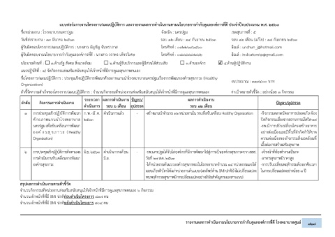 1 การประชุมเชิงปฏิบัติการพัฒนา ก.พ.-มี.ค. ดำเนินการแล้ว - -สร้างแกนนำจำนวน 93 หน่วยงานใน รพ.เพื่อขับเคลื่อน Healthy Organization -กิจกรรมตลาดนัดอาหารปลอดภัย ต้อง