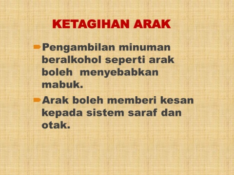 KETAGIHAN ARAK Pengambilan minuman beralkohol seperti arak boleh menyebabkan mabuk. Arak boleh memberi kesan kepada sistem saraf dan otak.