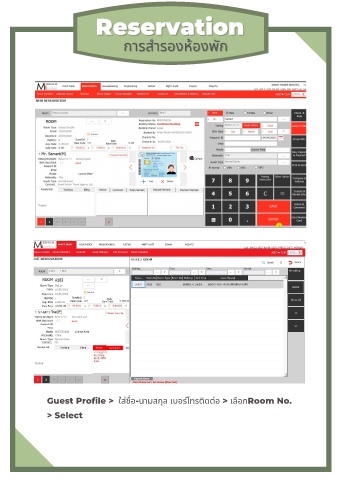 Reservation Reservation การสํารองห้องพัก การสํารองห้องพัก Guest Profile > ใส่ชื อ-นามสกุล เบอร์โทรตดตอ > เลอกRoom No. ่ ื ิ > Select