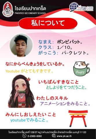 私について なまえ: ポンピパット。 クラス: 1/10。 がっこう: パ−クレツト。 なにからべんきょうをしているか。 Youtube がとてもすきです。 いちばんすきなこと としよりをてつだうこと。 わたしのスキル アニメーションをみること。 みんにしおしえたい こと youtubeでみること 。
