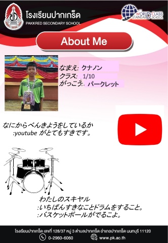 なまえ クナノン :ウイーラツト クラス:4/11 1/10 がっこう パークレット :パークレっト なにからべんきようをしているか :youtube がとてもすきです。 わたしのスキヤル :いちばんすきなことドラムをすること。 :バスケットボールがでるこよ。
