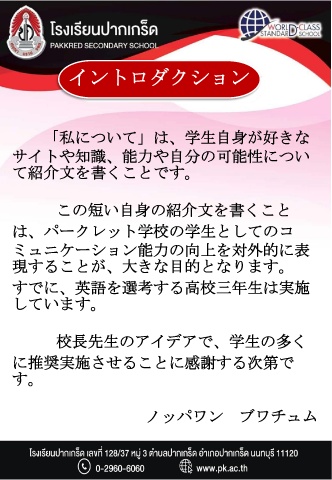 イントロダクション 「私について」は、学生自身が好きな サイトや知識、能力や自分の可能性につい て紹介文を書くことです。 この短い自身の紹介文を書くこと は、パークレット学校の学生としてのコ ミュニケーション能力の向上を対外的に表 現することが、大きな目的となります。 すでに、英語を選考する高校三年生は実施 しています。 校長先生のアイデアで、学生の多く に推奨実施させることに感謝する次第で す。 ノッパワン ブワチュム