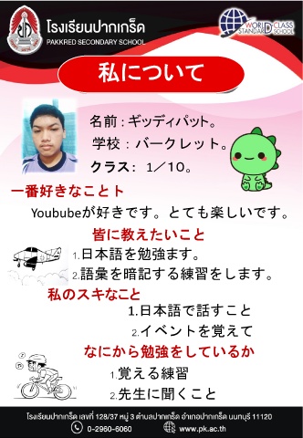 私について 名前 : ギッディパット。 学校:バークレット。 クラス: 1/10。 一番好きなことト Yoububeが好きです。とても楽しいです。 皆に教えたいこと 1.日本語を勉強ます。 2.語彙を暗記する練習をします。 私のスキなこと 1.日本語で話すこと 2.イベントを覚えて なにから勉強をしているか 1.覚える練習 2.先生に聞くこと