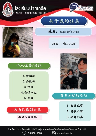 关于我的信息 姓名: อมรกานต์ หุนทอง ่ 班级: 初二八班 个人优势/技能 1.弹钢琴 2.会做饭 3.唱歌 4.会说中文 曾参加过的活动 5.跳舞 1.画画比赛 为自己感到自豪 2.唱歌比赛 扶老人过马路 3.跳舞比赛