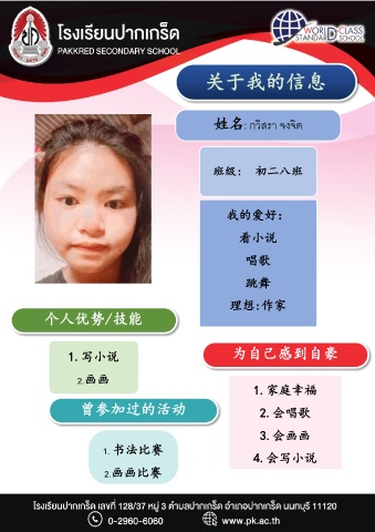 关于我的信息 姓名: กวิสรา จงจต ิ 班级: 初二八班 我的爱好: 看小说 唱歌 跳舞 理想:作家 个人优势/技能 1.写小说 为自己感到自豪 2.画画 1.家庭幸福 曾参加过的活动 2.会唱歌 3.会画画 1. 书法比赛 4.会写小说 2.画画比赛