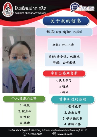 关于我的信息 姓名; ด.ญ. ณัฐธดา เจยุรัตน์ ิ 班级: 初二八班 爱好:看小说、玩游戏 梦想; 公司老板 为自己感到自豪 1. 认真学习 2. 绩点 3. 游泳 个人技能/优势 曾参加过的活动 1.做饭 1. 歌唱比赛 2.做点心 2.画画大赛 3.唱歌 3.啦啦操比赛 4.跳舞 4.舞蹈比赛