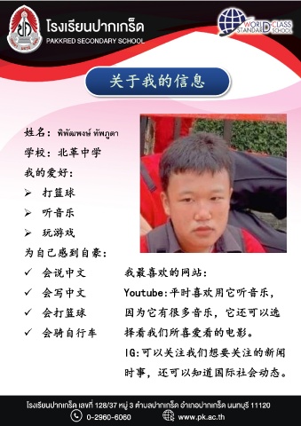 关于我的信息 姓名:พิพัฒพงษ์ ทัพภูตา 学校:北革中学 我的爱好: 打篮球 听音乐 玩游戏 为自己感到自豪: 会说中文 我最喜欢的网站: 会写中文 Youtube:平时喜欢用它听音乐, 会打篮球 因为它有很多音乐,它还可以选 会骑自行车 择看我们所喜爱看的电影。 IG:可以关注我们想要关注的新闻 时事,还可以知道国际社会动态。