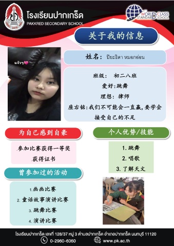 关于我的信息 姓名: ปิยะธดา หมอกอ่อน ิ 班级: 初二八班 爱好:跳舞 理想: 律师 座右铭:我们不可能会一直赢,要学会 接受自己的不足 为自己感到自豪 个人优势/技能 .参加比赛获得一等奖 1.跳舞 .获得证书 2.唱歌 3.了解天文 曾参加过的活动 1.画画比赛 2. 童话故事演讲比赛 3. 跳舞比赛 4. 演讲比赛