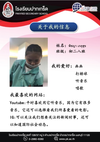 关于我的信息 姓名:พิชญา เกตสข ุ ุ 班级:初二八班 我的爱好:画画 打排球 听音乐 唱歌 我最喜欢的网站: Youtube:平时喜欢用它听音乐,因为它有很多 音乐,它还可以选择看我们所喜爱看的电影。 IG:可以关注我们想要关注的新闻时事,还可 以知道国际社会动态。
