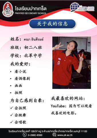 关于我的信息 姓名:คณา ยินดีรมย์ 班级:初二八班 学校:北革中学 我的爱好: • 看小说 • 看偶像剧 • 画画 • 拍照 我最喜欢的网站: 为自己感到自豪: YouTube:因为可以观看 会拍照 我喜欢的电影。 会跳舞 会唱歌