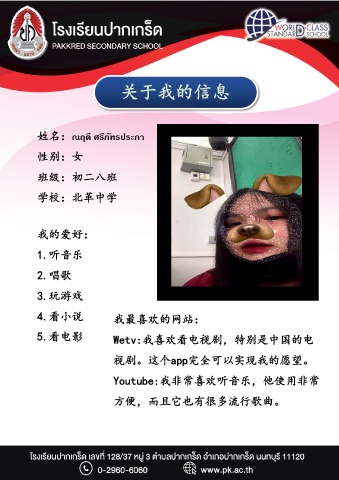 关于我的信息 ี 姓名:ณฤด ศรี ภัทร ประภา 性别:女 班级:初二八班 学校:北革中学 我的爱好: 1.听音乐 2.唱歌 3.玩游戏 4.看小说 我最喜欢的网站: 5.看电影 Wetv:我喜欢看电视剧,特别是中国的电 视剧。这个app完全可以实现我的愿望。 Youtube:我非常喜欢听音乐,他使用非常 方便,而且它也有很多流行歌曲。