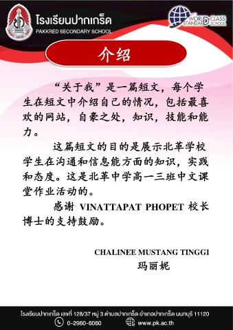介绍 “关于我”是一篇短文,每个学 生在短文中介绍自己的情况,包括最喜 欢的网站,自豪之处,知识,技能和能 力。 这篇短文的目的是展示北革学校 学生在沟通和信息能方面的知识,实践 和态度。这是北革中学高一三班中文课 堂作业活动的。 感谢 VINATTAPAT PHOPET 校长 博士的支持鼓励。 CHALINEE MUSTANG TINGGI 玛丽妮