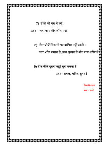 7) तीनों िो बस में रखेंI उतर - मन, िाम और लोभ मद। 8) तीन चीजें मनिलने पर वामपस नहीं आती I उतर -तीर िमान से, बात जुबान से और प्राण शरीर से। 9) तीन चीजें दूसरा नहीं चुरा सिता I उतर - अिल, चररत्र, हुनर I मशवानी धािड़ िक्षा :- नवमी