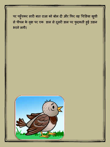 पर पहूँचकर सारी बात राजा को बोल दी और कफर वह चचडडया खुशी ु से पीपल क े वक्ष पर एक डाल से दूसरी डाल पर फ ु दकती हई उडान ृ ु भरने लिी।