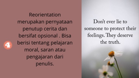 Reorientation merupakan pernyataan penutup cerita dan bersifat opsional . Bisa berisi tentang pelajaran moral, saran atau pengajaran dari penulis.