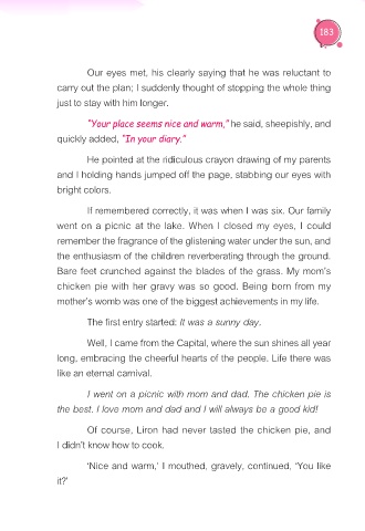 I went on a picnic with mom and dad. The chicken pie is
